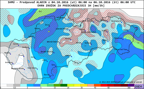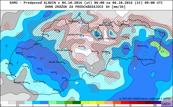 Obr.: Očakávané skupenstvo a intenzita zrážok podľa meteorologického modelu ALADIN od SHMÚ /viac tu http://www.shmu.sk/sk/?page=1&id=meteo_num_zra/ na 6Z A 9Z vo štvrtok ráno