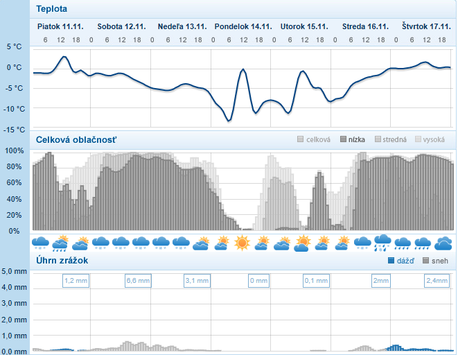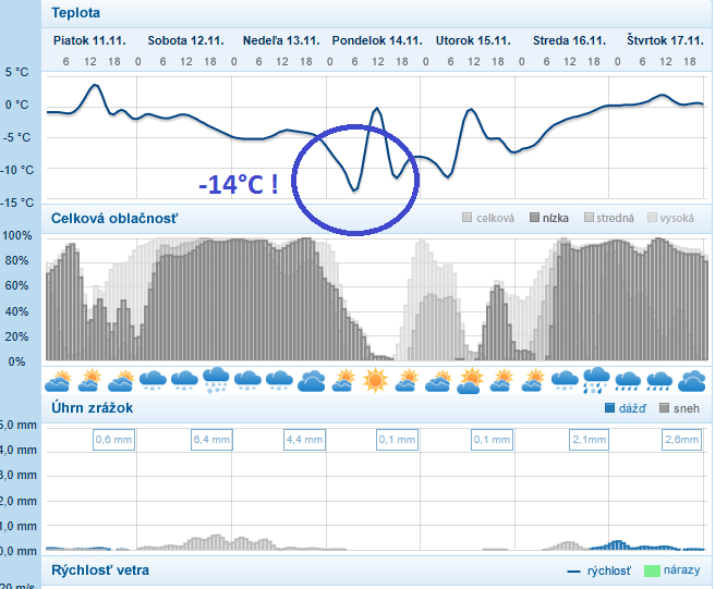 Už v nedeľu by v prípade zmenšenej oblačnosti mohla minimálna teplota v dolinách a vysokopoložených kotlinách s hrubou snehovou pokrývkou poklesnúť na okolo -10°C, nasledovať bude naozaj studený novembrový deň - na Hornej Orave hrozí maximálna teplota len -4°C, na juhu to bude maximálne do +2/+3°C. Najchladnejšie rána však prídu až po následnom vyjasnení a hlavne počas prílevu suchého studeného vzduchu, ktorý sa v noci bude vďaka radiačnému vyžarovaniu rýchlo ochladzovať. V pondelok či utorok ráno čakajú nače horské doliny a vysokopoložené husto obývané kotliny silné mrazy od -10 do -15°C, výnimočne, hlavne v oblasti Oravy či Zamaguria to v prípade vhodných podmienok môže byť až -17°C. Vo väčšine zvyšku Slovenska bude tiež veľmi chladno, od -5 do -10°C, len v tradičných vinárskych oblastiach charakteristických s najmenším počtom mrazových dní to môže byť okolo -3°C. Sever by si mal až do stredy udržať okolo 5-dňovú šnúru s celodennými mrazmi a maximálnymi teplotami len 0/-3°C, na juhu sa cez deň oteplí zľahka nad nulu, v prípade nízkej oblačnosti alebo hmly môže aj v najteplejších oblastiach celodenne mrznúť. Výstupy na okolo 20. novembra, kedy sa malo od západu v Európe citeľne otepliť, rozpršať a rozfúkať (na horách víchrica) sa najnovšie začínajú uberať smerom k chladnejším variantám a zdá sa, že Sibírska výš od východu môže ešte v ďalšom vývoji prekvapiť a zonalitu oslabiť. To kedy sa na Slovensku po vpáde zimy oteplí sa môžete dozvedieť každý deň v priebežne aktualizovanej dlhodobej predpovedi /http://meteoinfo.sk/predpoved-15-dni/.