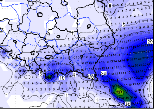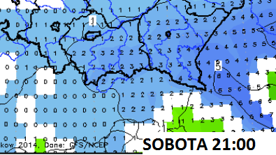 Obr.: V priebehu soboty sa rozsneží takmer na celom území Slovenska vrátane nížin, na nasledujúcom obrázku vidno očakávaný stav skupenstva zrážok v sobotu večer od 21Z /http://meteomodel.pl/gfs-para/PTYPE/45/
