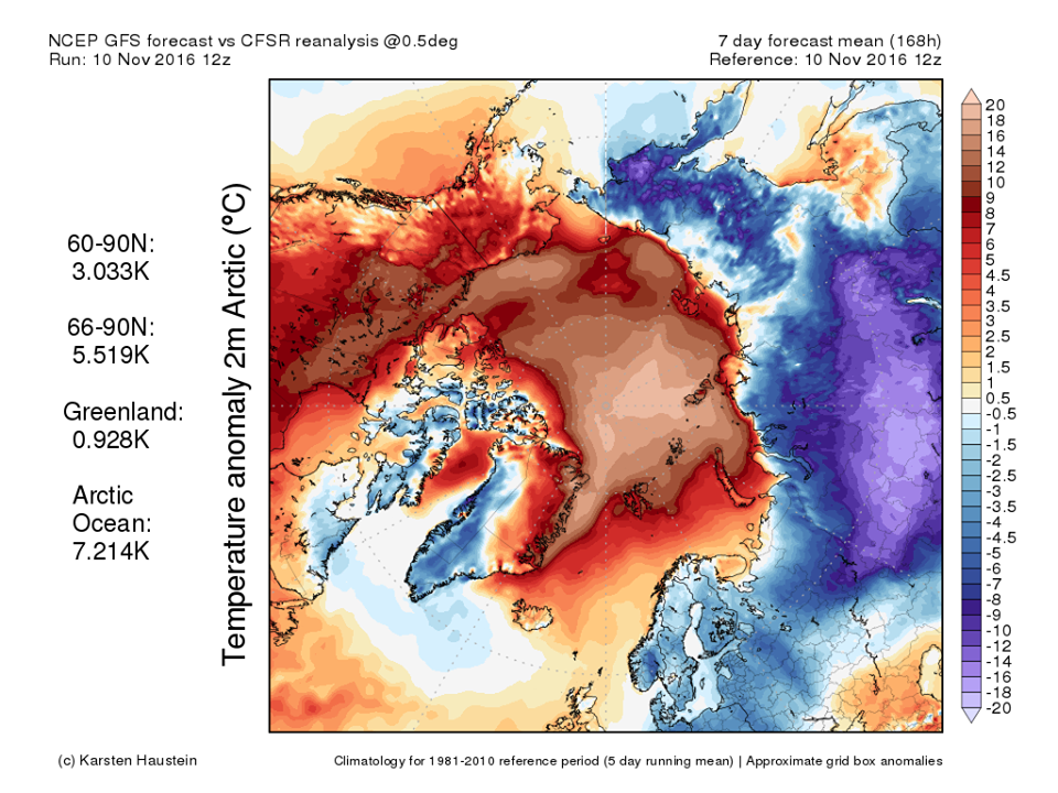 Obr.: Teplotné odchýlky od DP medzi 10. a 17. novembrom 2016 - Arktída zotrváva mimoriadne teplá, studený vzduch z nej sa vylial do miernych šírok, najmä Eurázie /Bez počasia, FB/