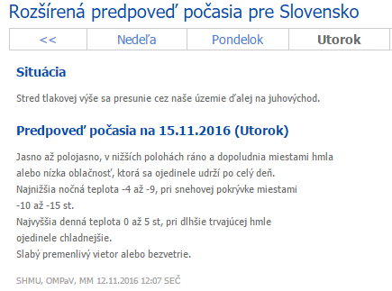 Obr.: Oficiálna predpoveď SHMÚ na utorok zo soboty (tá z nedele je o 1°C teplejšia) /http://www.shmu.sk/sk/?page=1&id=meteo_tpredpoved_skcele&area=cele&ts=1479168000/