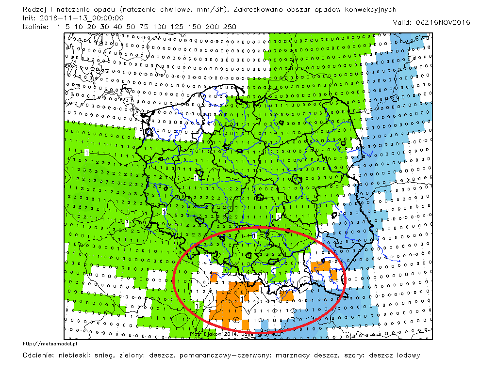 Obr.: Očakávané skupenstvo zrážok v stredu ráno - oranžová = mrznúci dážď a tvorba poľadovice /http://meteomodel.pl//
