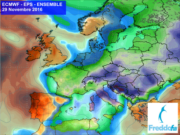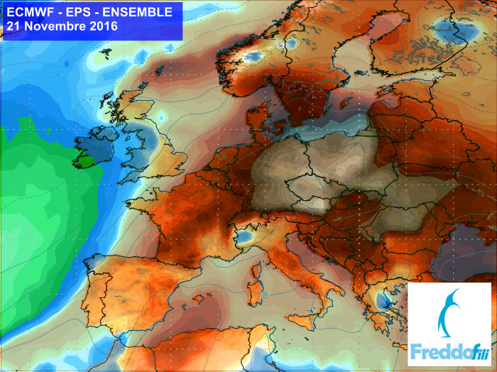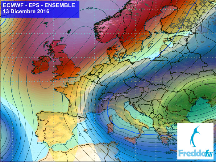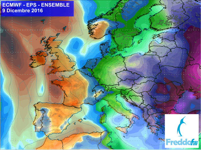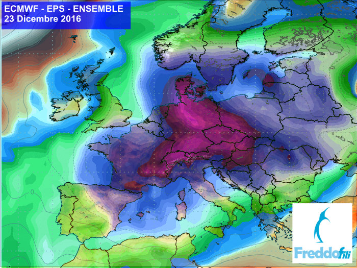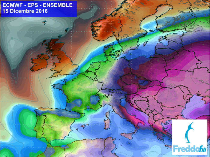 Obr.: Čerstvá predpoveď očakávanej teploty v 850 hPa podľa modelu ECMWF, ktorú zverejnili Taliani /http://www.freddofili.it/14887-dicembre-ultime-proiezioni-ecmwfens-freddissime-gelo-dalla-russia//