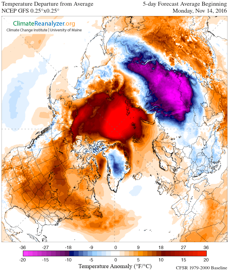 Obr.: Stratosférické oteplenie / rozpad polárneho vortexu / arktický zosilňujúci efekt (Arctic Amplification) sa do konca novembra ešte zosilní - aktuálne je nad Arktídou o +20°C teplejšie ako DP a nad Sibírou o takmer -20°C chladnejšie /http://climatereanalyzer.org/