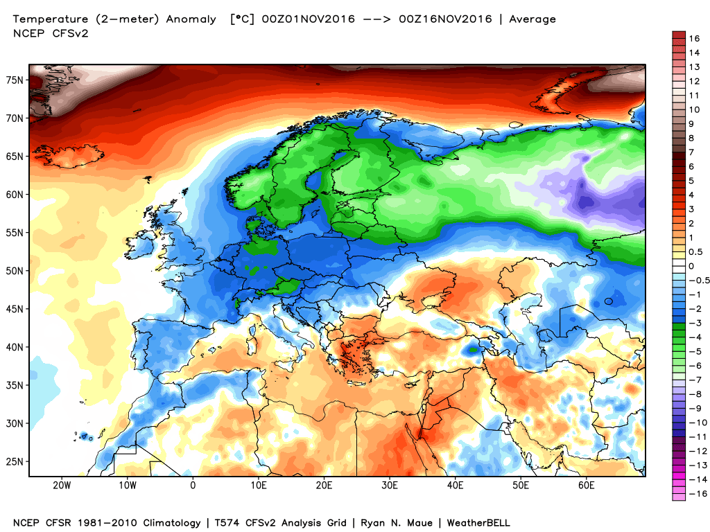 Prvá polovica novembra bola vďaka "sibírskej anomálii" /http://meteoinfo.sk/clanok/51886-studena-anomalia-zo-sibiri-nas-bude-trapit-az-do-20.11.-v-ba-nasnezilo-a-do-ulic-vysli-odhrnace/ vo veľkej časti Európy chladná, na Slovensku až veľmi chladná s odchýlkou -2/-3°C od DP /NCEP/