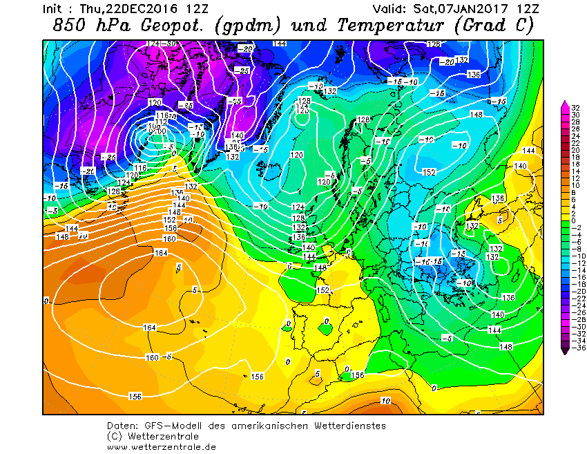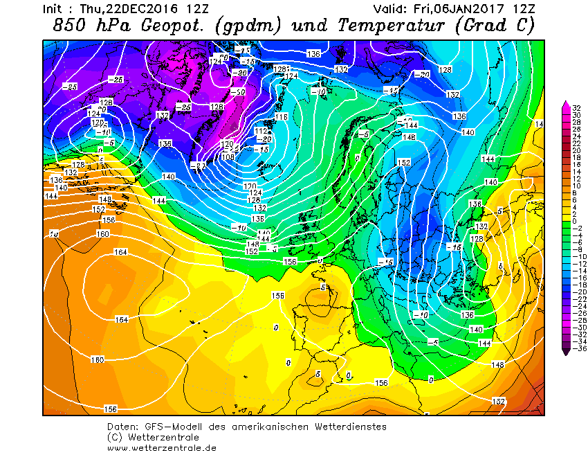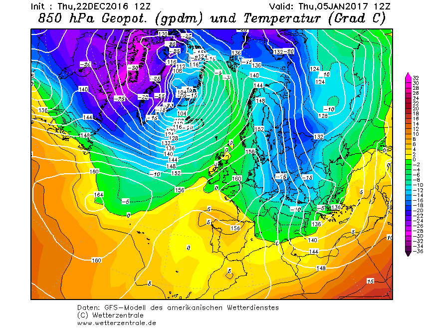 Hlbokých tlakových níží nad Atlantikom bude vďaka rozsiahlej cyklonálnej oblasti, ktorá sa sem presunula dostatok a dostatok bude aj studeného vzduchu, ktorý sa od začiatku decembra do konca roka presunul zo Sibíre nad Labrador, Grónsko a postupne dorazí až nad Špicbergy. O možných scenároch ohľadom nového stratosférického oteplenia píšeme v predchádzajúcom článku /http://meteoinfo.sk/clanok/51920-na-severnom-pole-sa-opat-otepli-na-0c-hrozi-rozpad-vortexu-a-vrchol-zimy-podobne-ako-pred-rokom/ - všetko nasvedčuje tomu, že už čoskoro - možno o 2 - 3 týždne, medzi 5.-15. januárom môžeme zažiť vrchol zimy 2016/17. Behy zo štvrtka 12Z už čakajú výrazný vpád zimy od severu od 5. januára, v hladine 850 hPa by nad nás až po Balkán mal zasahovať jazyk studeného vzduchu priamo z Arktídy. Spočiatku sa očakáva aj intenzívnejšie sneženie a neskôr budú hroziť 20-stupňové mrazy, keďže vzduchová hmota by mala byť chladnejšia ako tá, ktorá priniesla -18,7°C do Oravskej Lesnej na začiatku decembra. Model okrem toho očakáva orkán na horách a poriadnu fujavicu v nižších polohách, situácia ako celok bude pravdepodobne ukončená vyliatím studeného vzduchu z oblasti Grónska na zadnej strane cyklonálnych oblastí, ktoré sa presunú nad východnú polovicu Európy. Už krátko po Vianociach by sme mali presnejšie vedieť, aká bude silvestrovská noc.
