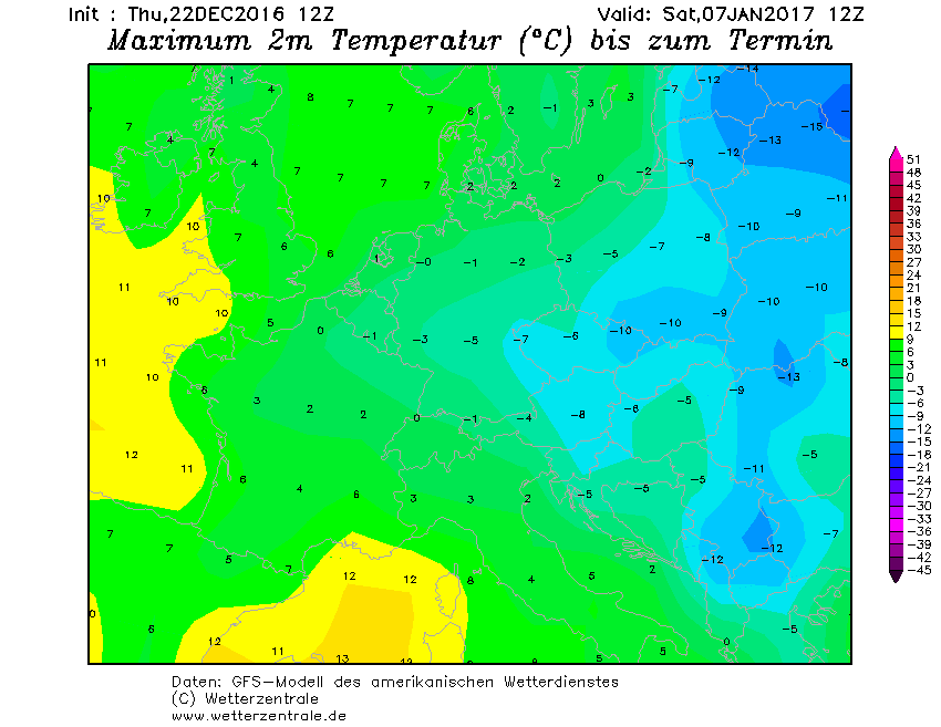 Prvé, slabšie ochladenie vo vzduchovej hmote okolo -10°C v 850 hPa dorazí už od 27. decembra do 1. januára - najprv bude vlhšie, so snežením, na juhozápade zmiešanými zrážkami a o niečo vyššími teplotami, postupne by sa k nám mal dostať suchší vzduch a zosilnejú ranné mrazy. Zatiaľ to bude však len také bežné ochladenie, na juhu budeme cez deň nad nulou, na severe pod nulou.