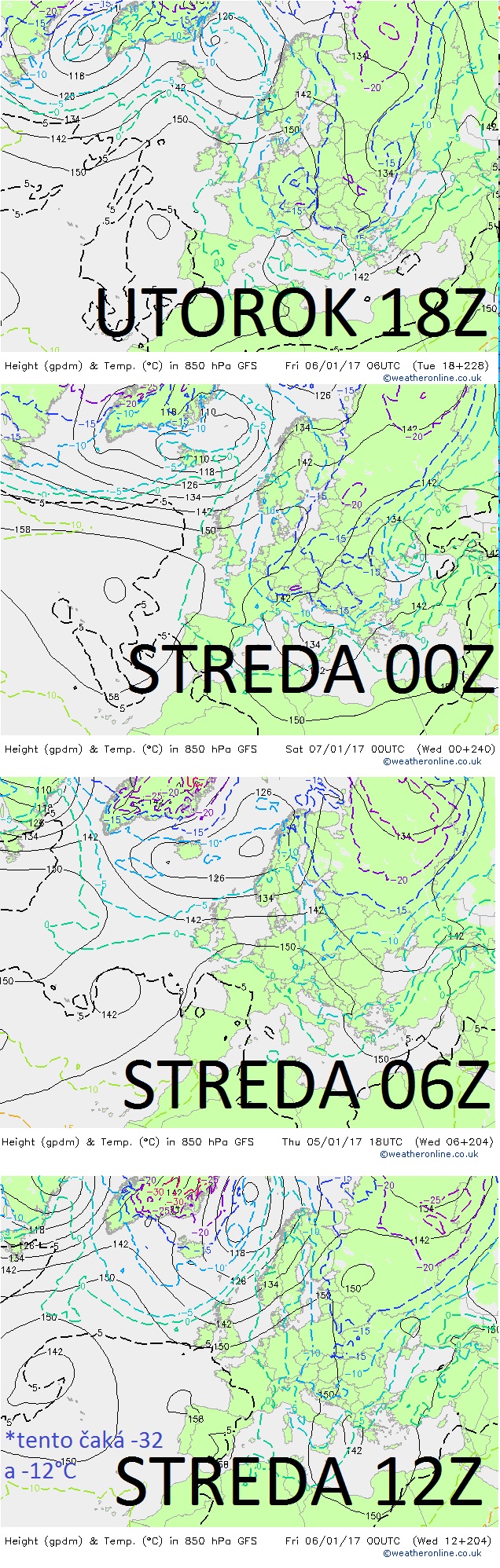 Predpovedné materiály v utorok a v stredu 27. a 28. decembra začali stupňovať blížiace sa absolútne namerané teploty počas blížiacej sa vlny chladu. Náš triezvy reálny odhad hovorí, že -20°C okolo Troch kráľov by malo padnúť, v dlhodobej predpovedi zatiaľ čakáme do -23°C. Niektoré výstupy sú však ešte extrémnejšie - podobne ako pred mrazmi na začiatku decembra sa objavili aj málo realistické odhady. Pred piatym decembrom najextrémnejší beh GFS čakal -27°C, nakoniec bolo -18,7°C, teraz bez z 28.12. 2016 12Z čaká pre sever -32°C a čakáme že realita bude podobná ako na začiatku decembra, teda - že konečné namerané teploty budú okolo 9°C vyššie ako tieto najextrémnejšie varianty, teda do -23°C. Takéto teploty však môžu byť aj vrcholom tohtoročnej zimy, aj keď v ďalšom priebehu januára očakávame ešte jednu, výraznejšiu vlnu chladu, kedy bude stratosférické oteplenie vrcholiť - práve tieto situácie sa prejavujú vyliatím obsahu studenej zmohutnenej Grónskej výše nad Európu a tuhými mrazmi. Dvadsaťstupňové mrazy sú však už pravdepodobné aj okolo Troch kráľov, kedy sú šance, že prekonáme -20°C vyššie ako v noci zo 4. na 5. decembra.