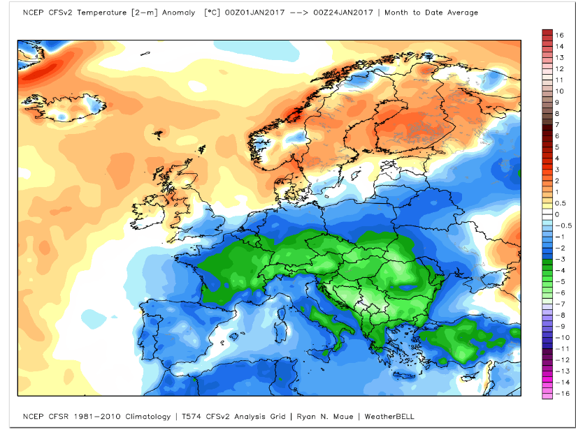 Obr.: Takto vyzerajú doterajšie januárové odchýlky od DP v Európe - veľká časť centrálnych partií kontinentu hlási až o 5°C chladnejší január ako zvyčajne /FB SHMÚ/