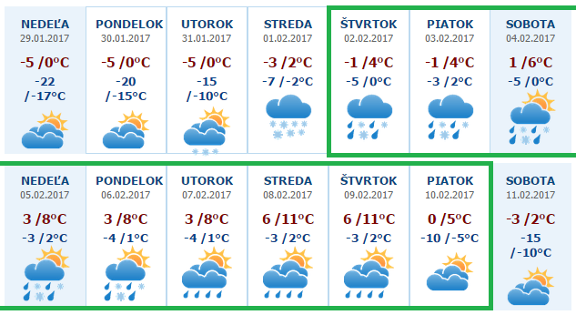 Vypĺňajúca sa cyklóna nad Nemeckom vyšle na prelome mesiacov nad Slovensko oklúzny front - z toho sa na západnom a strednom Slovensku rozsneží už v utorok, 31. januára popoludní a večer. Sneženie bude pretrvávať v stredu 1. februára, kedy pribudne aj cca 3 - 8 cm, regionálne 10 - 15 cm novej snehovej pokrývky. Zo snehu sa však tešiť dlho nebudeme, aspoň nie regióny do 400 - 500 metrov nad morom, pretože už od štvrtka do nedele sa k nám dostane teplejší oceánsky vzduch, ktorý zaručí, že hranica sneženia stúpne na 400, neskôr 600 metrov. Postupne sa dostaví aj sľubované oteplenie, aj keď v nedeľu ho modely o niečo zmiernili. Odmäk, topenie snehu a dážď môžu narobiť problémy najmä na východnom Slovensku, kde sa stále nachádza veľa snehu v snehovej pokrývke Situácia na východe by mala byť najkritickejšia okolo 5. februára (3.-7.2.). Najteplejšie by nám malo byť už cez víkend a celý nasledujúci pracovný týždeň, teploty pri vhodných podmienkach stúpnu aj nad +10°C, ak sa vrátia veľmi teplé výstupy, aj do +15°C, na miestach bez slnečného svitu však ostane celkom sychravo a chladnejšie, okolo +5°C. Zima v každom prípade povolí, no na ďalšie obdobie sa už začína črtať jej návrat. Jednak budú k nášmu regiónu blízko zásoby mohutnej Sibírskej výše, ktorá bude naďalej prinášať tuhé mrazy nad východnú Európu, no jednak aj na zadnej strane cyklonálnej oblasti, presúvajúcej sa zo severného Atlantiku nad Európu. Modely dokonca počítajú s výrazným atmosférickým blokovaním - takže namiesto studených vzduchových hmôt z Grónska a Labradoru sa môžu nad naše územie môže vrátiť opäť studený vzduch z východu. Je tak možné, že zima má pre nás ešte pripravenú poslednú - a výraznú, rozlúčku.
