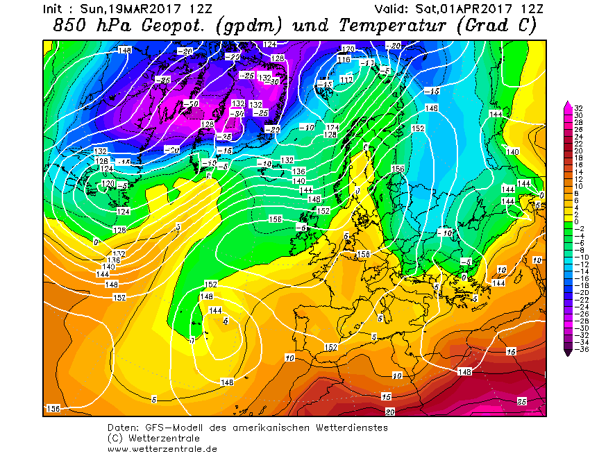 Obr.: Možný vpád sibírskeho vzduchu na 1. apríl - teplota v 850 hPa okolo -10°C indikuje najprv snehové prehánky, následne silné mrazy /http://old.wetterzentrale.de/topkarten/fsavneur.html/