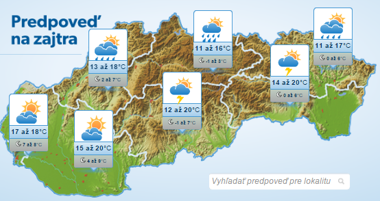 Obr.: Utorok už bude veľmi teplý - napriek prehánkam a búrkam sa oteplí na juhu až do +20°C /http://meteoinfo.sk/predpoved-slovensko-zajtra/