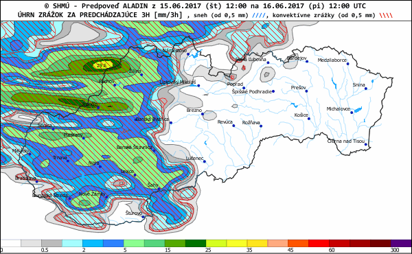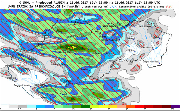 Obr.: Očakávané 3-hodinové úhrny zrážok podľa modelu ALADIN v piatok 16. júna o 14:00, 17:00 a 20:00 /viac na http://www.shmu.sk/sk/?page=476/