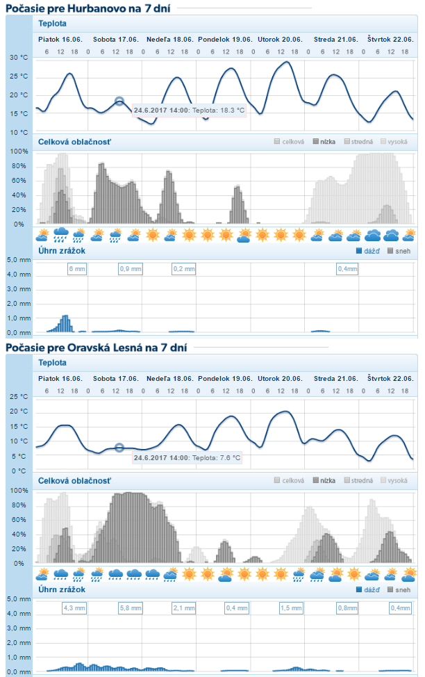 Obr.: Očakávané maximálne teploty podľa modelu GFS v sobotu 17. júna 2017 v Oravskej Lesnej a Hurbanove - sobota bude najchladnejším júnovým dňom a možno aj najchladnejším dňom celého leta /http://meteoinfo.sk/predpoved-slovensko/