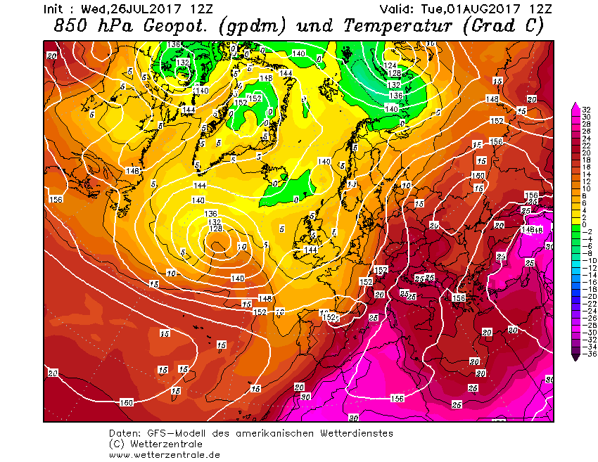 Obr.: Očakávaná teplota v 850 hPa 1. augusta 2017 podľa stredajšieho behu z 12Z (beh z 18Z bol s minimálnymi zmenami) /http://old.wetterzentrale.de/topkarten/fsavneur.html/
