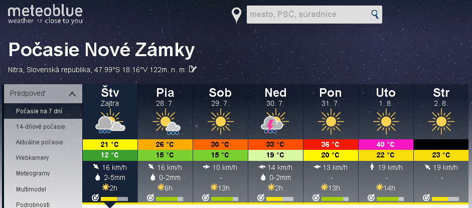Obr.: 40-stupňové teploty neočakáva len GFS, ale napr. aj MeteoBlue /https://www.meteoblue.com/en/weather/forecast/week/detva_slovak-republic_3060589/
