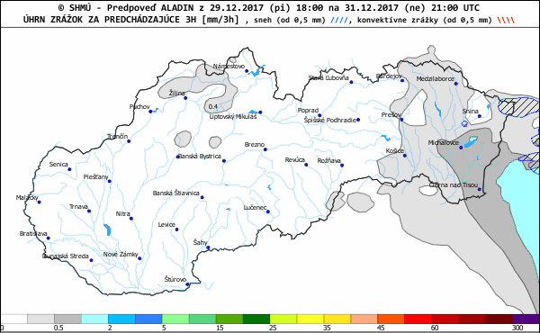 Obr.: Očakávané zrážky 2 hodiny pred polnocou, po prechode teplého frontu, podľa modelu ALADIN /SHMÚ/