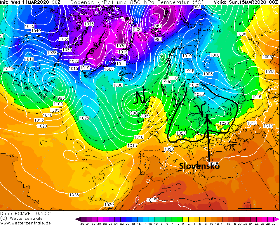 Brázda nízkeho tlaku vzduchu, ktorá prinesie koncom týždňa aspoň návrat mrazov, aj to nie na úplne celé územie, sa prejaví najmä cez pracovný týždeň v západnej a juhovýchodnej Európe. Kým na jej zadnej strane až nad Maroko ďaleko na juh prenikne studený vzduch medzi 0/-5°C v 850 hPa, na jej prednej strane dorazí až na Balkán, Ukrajinu a juh európskeho Ruska extrémne teplý vzduch, pôvodom zo Sahelu až južnej Sahary (oblasť Sudánu, Čadu). Nad stredomorské pobrežie Egypta a Lýbie sa dostane naozaj horúci vzduch s teplotou v 850 hPa až nad +20°C čo spôsobí výrazné oteplenie a doslova horúčavy okolo +35°C (napr. aj v Káhire). Tropická 30-ka by mohla byť ohrozená aj na Cypre, Turecko na stredu čaká až +28°C (na severozápade krajiny), len trochu nižšie teploty budú v Bulharsku a prehriaty s možnosťou letných teplôt slabo nad +25°C bude celý Balkán, možno až južná Ukrajina, fén sa prejaví aj za severnými kaukazskými svahmi. Extrémne teplý vzduch sa ocitne veľmi blízko nášho územia, no na Slovensku bude "len veľmi teplo", aj to len na juhovýchode, kde môže prekvapiť okolo +15°C. Podobne na tom bude východ Maďarska, v Rumunsku sa už teplota zastaví niekde medzi +20/+25°C.