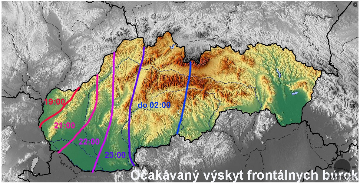 Obr.: Očakávaný príchod frontálnych búrok v nedeľu večer podľa Imetea /http://www.imeteo.sk/