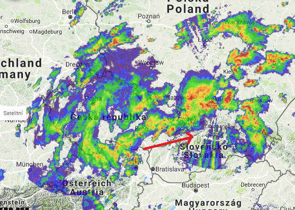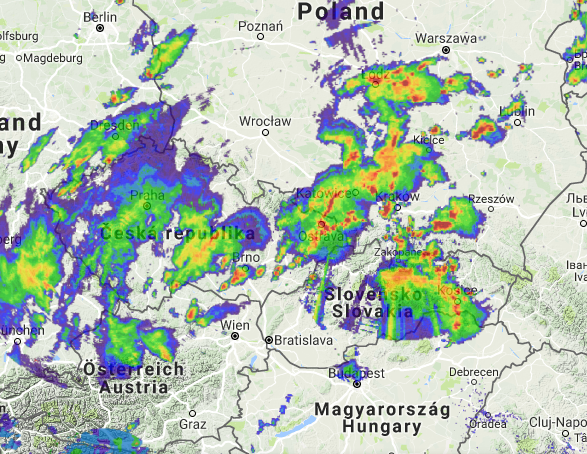 Obr.: Počas doby písania článku sa už búrky vyvinuli aj západne od hraníc Slovenska - nad Rakúskom. Zdá sa, že silná búrková línia zasiahne západné Slovensko už v najbližších hodinách a minútach /http://radareu.cz/?lng=sk/