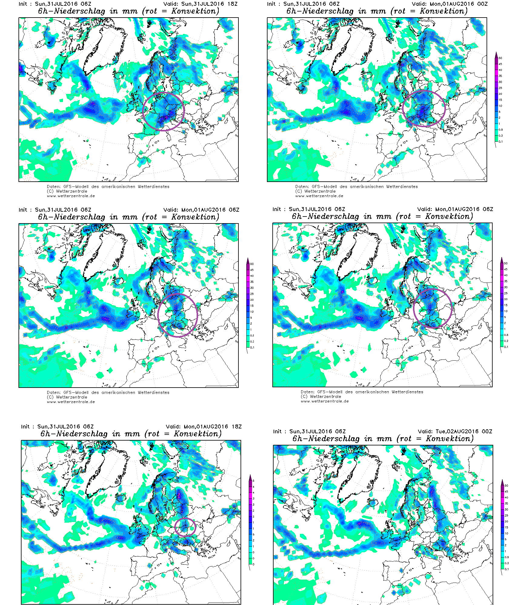 Obr.: Príchod silných búrok v nedeľu večer a prechod frontu so zrážkami podľa modelu GFS /http://old.wetterzentrale.de/topkarten/fsavneur.html/