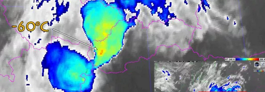 Obr.: Bunky silných búrok nad západným Slovenskom vo svojich vrholoch dosahujú až -60°C, čo je znakom veľmi silných búrok /imeteo.sk/