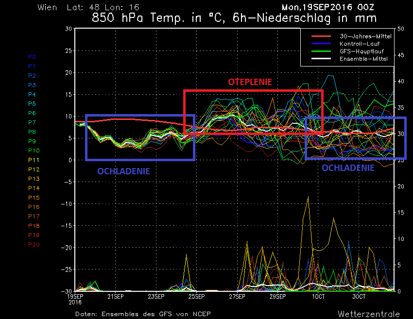 Medzi ochladením v súčasnom týždni a týmto ochladením začiatkom októbra by sa však ešte malo prechodne zlepšiť počasie a dorazia - možno posledné - letné dni nad +25°C, niekedy na prelome septembra a októbra 2016. Zlepšenie počasia sa očakáva už na konci tohto týždňa, v nedeľu by to však stále malo byť na juhozápade len do +23°C. Teplé a slnečné jesenné dni sa zatiaľ čakajú na pondelok a utorok 26.-27. septembra s teplotami do +26°C, aj toto oteplenie by však mal prerušiť studený front, po prechode ktorého sa ešte do začiatku októbra opäť mierne oteplí. Tak ako sme naznačili na obrázkoch vyššie (pre 4.10.), v ďalšom vývoji sa očakávajú ďalšie prepady cyklón a dráh cyklón do južnejších šírok a s nimi spojené ochladenia.