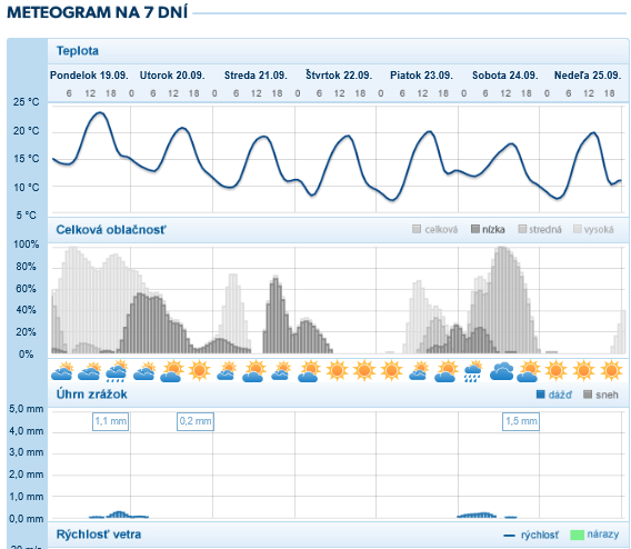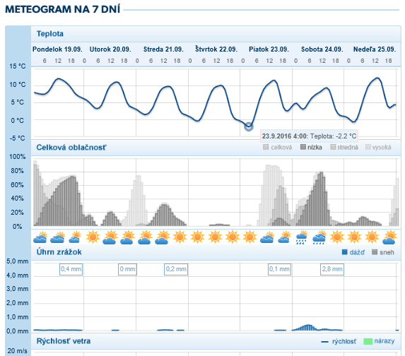 Obr.: Náš meteogram /http://meteoinfo.sk/predpoved-slovensko/ čaká aj v Hurbanove denné teploty pod +20°C, v Oravskej Lesnej bude len okolo +10°C a v piatok ráno -2°C
