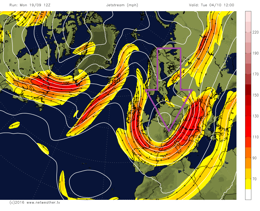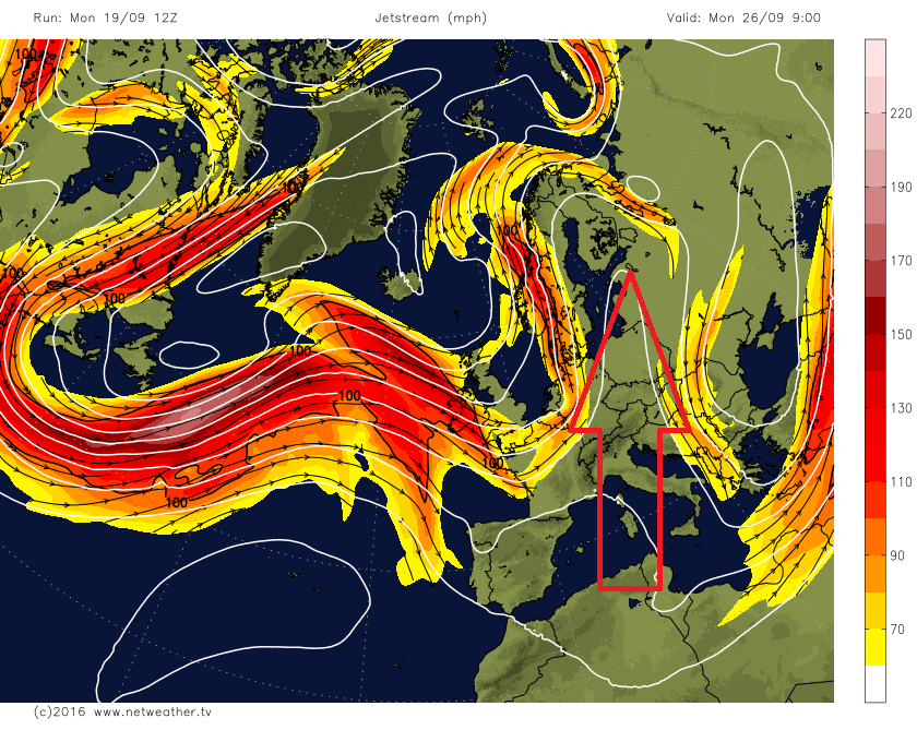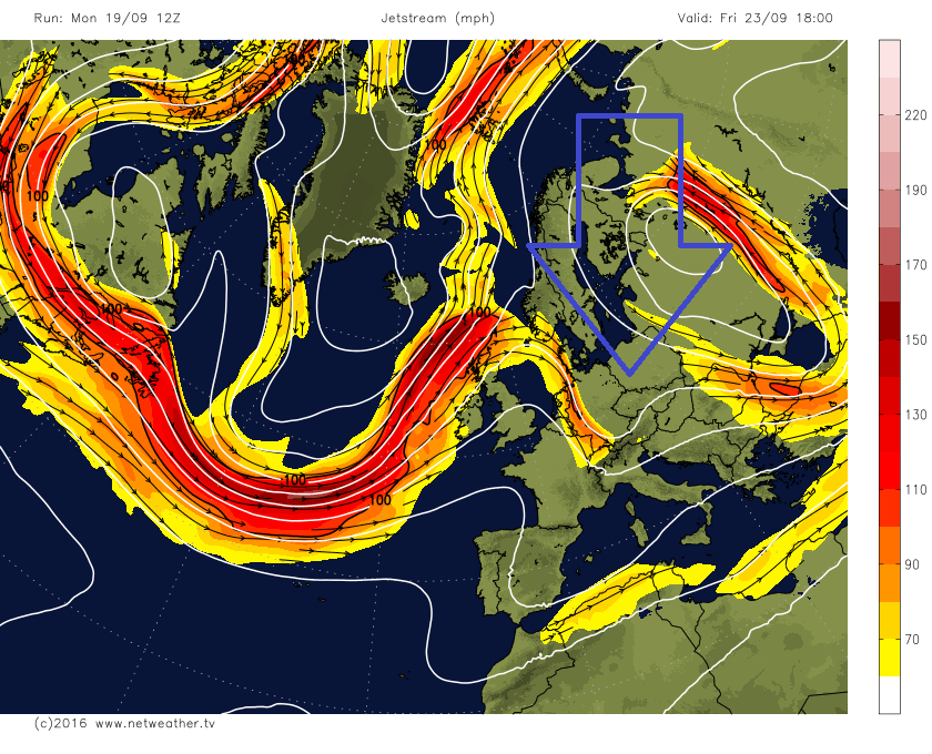 Obr.: Poloha dráhy cyklón (jet - streamu / polárneho frontu) v najbližšom období - ochladenie v tomto týždni spôsobí hlboká níž nad východnou Európou a studený vzduch severne od jet-streamu (Obr.1), oteplenie koncom septembra bude súvisieť s výbežkom vyššieho tlaku na sever ponad naše územie, pričom dráha cyklón sa presunie na sever od nášho územia (Obr. 2) a okolo 4. októbra sa znova očakáva prepad nízkeho tlaku a dráh cyklón do južnejších šírok čo prinesie ochladenie, ae aj zrážky (Obr.3) /http://www.netweather.tv/index.cgi?action=jetstream;sess=/