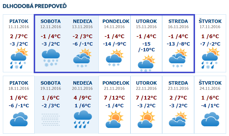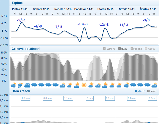 Už v nedeľu by v prípade zmenšenej oblačnosti mohla minimálna teplota v dolinách a vysokopoložených kotlinách s hrubou snehovou pokrývkou poklesnúť na okolo -10°C, nasledovať bude naozaj studený novembrový deň - na Hornej Orave hrozí maximálna teplota len -4°C, na juhu to bude maximálne do +2/+3°C. Najchladnejšie rána však prídu až po následnom vyjasnení a hlavne počas prílevu suchého studeného vzduchu, ktorý sa v noci bude vďaka radiačnému vyžarovaniu rýchlo ochladzovať. V pondelok či utorok ráno čakajú nače horské doliny a vysokopoložené husto obývané kotliny silné mrazy od -10 do -15°C, výnimočne, hlavne v oblasti Oravy či Zamaguria to v prípade vhodných podmienok môže byť až -17°C. Vo väčšine zvyšku Slovenska bude tiež veľmi chladno, od -5 do -10°C, len v tradičných vinárskych oblastiach charakteristických s najmenším počtom mrazových dní to môže byť okolo -3°C. Sever by si mal až do stredy udržať okolo 5-dňovú šnúru s celodennými mrazmi a maximálnymi teplotami len 0/-3°C, na juhu sa cez deň oteplí zľahka nad nulu, v prípade nízkej oblačnosti alebo hmly môže aj v najteplejších oblastiach celodenne mrznúť. Výstupy na okolo 20. novembra, kedy sa malo od západu v Európe citeľne otepliť, rozpršať a rozfúkať (na horách víchrica) sa najnovšie začínajú uberať smerom k chladnejším variantám a zdá sa, že Sibírska výš od východu môže ešte v ďalšom vývoji prekvapiť a zonalitu oslabiť. To kedy sa na Slovensku po vpáde zimy oteplí sa môžete dozvedieť každý deň v priebežne aktualizovanej dlhodobej predpovedi /http://meteoinfo.sk/predpoved-15-dni/.