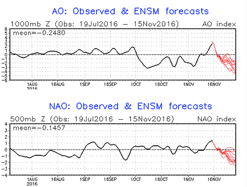 Obr.: Očakávaný prepad indexu spôsobí návrat zimných podmienok koncom novembra a v decembri 2016 /http://www.cpc.ncep.noaa.gov/products/precip/CWlink/pna/nao.sprd2.gif; http://www.cpc.ncep.noaa.gov/products/precip/CWlink/daily_ao_index/ao.sprd2.gif/