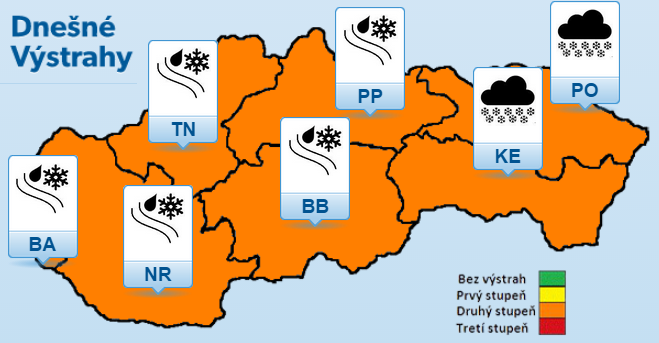 Ako v stredu ráno dorazil teplý front, na väčšine územia sa rozsnežilo - zatiaľ len krajný západ hlási zmiešané zrážky alebo dážď, miestami už prešlo sneženie aj do mrznúcich zrážok. Miestami sa vytvorila aj niekoľkocentimetrová snehová pokrývka a to aj na Podunajskej nížine. Ráno a dopoludnia sa mrznúci dážď rozšíri zo západného nad stredné Slovensko a na cestách sa bude tvoriť početná poľadovica (!), vodičom preto odporúčame, aby jazdili opatrne. Na východe by sa mrznúce zrážky mali vyskytovať až popoludní a večer, na Zemplíne bude snežiť až do štvrtka a sneženie sa tu na mrznúci dážď zmení najneskôr. Vo východnej polovici tak aj vďaka záporným nočným teplotám bude poľadovica hroziť aj vo štvrtok, najmä dopoludnia.
