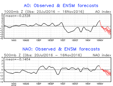 Obr.: Očakávaný vývoj AOi a NAOi sľubuje ďalšie zlepšenie zimných podmienok, pred ochladením však zažijeme týždeň tepla /http://www.cpc.ncep.noaa.gov/products/precip/CWlink/pna/nao.sprd2.gif; http://www.cpc.ncep.noaa.gov/products/precip/CWlink/daily_ao_index/ao.sprd2.gif/