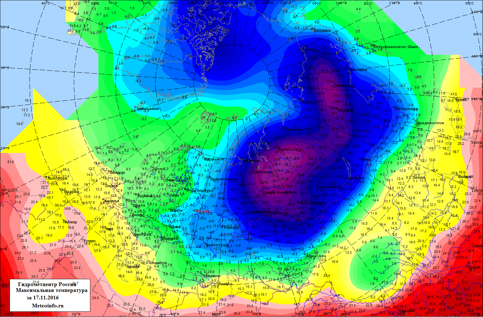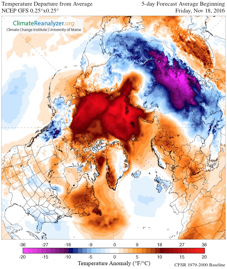 Obr.: Očakávané odchýlky cez +20°C nad Arktídou a pod -20°C od dlhodobého priemeru nad Sibírou. Podarí sa vďaka AO- a NAO- dostať studenému vzduchu zo Sibíre na prelome novembra a decembra aj na Slovensko? /http://meteoinfo.sk/clanok/51890-do-katariny-bude-teplo-zima-vsak-udrie-zas-zda-sa-ze-dlhodobo/