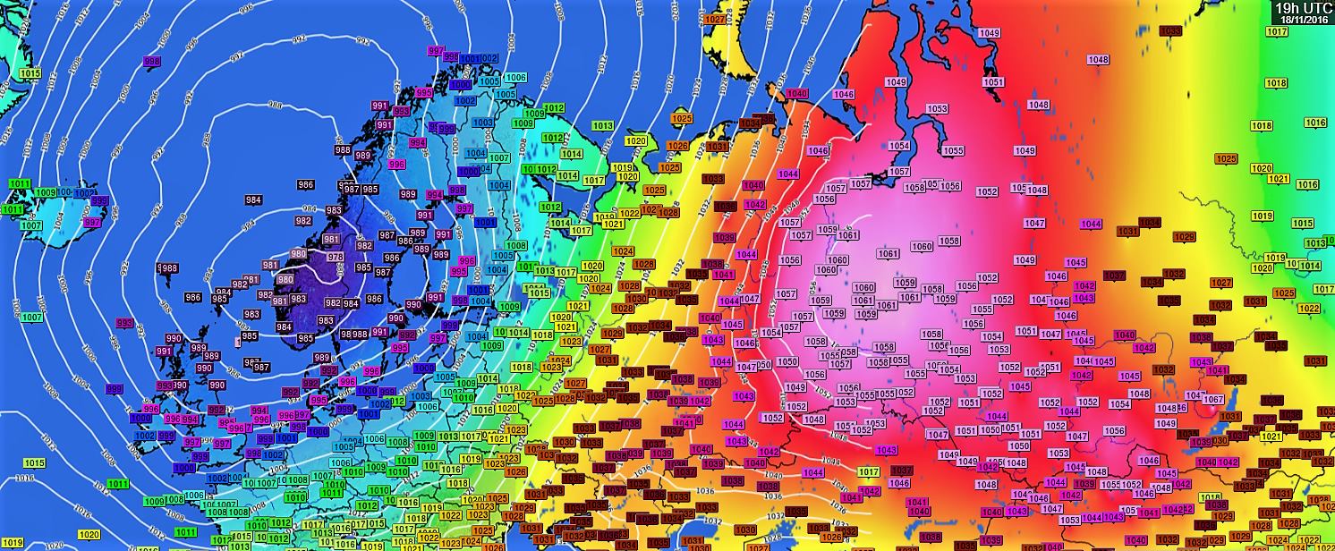 Obr.: Detail na výrazný tlakový gradient medzi Sibírskou výšou a hlbokou nížou nad SZ Európou (Bez počasia, FB)