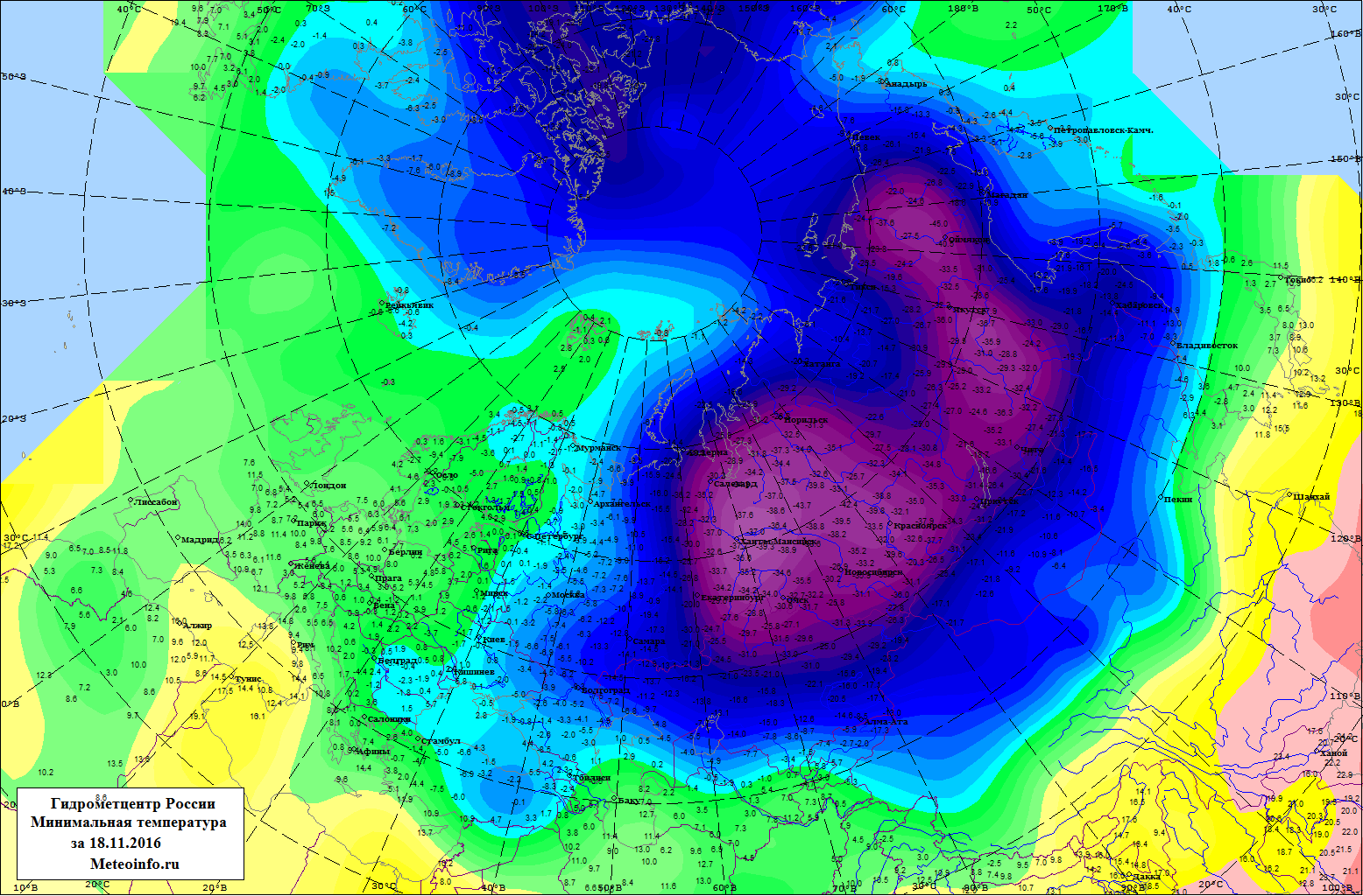 Obr.: Aktuálne zaznamenané minimálne a maximálne denné teploty v Rusku, neďaleko európskeho územia, až do -45°C /Bez počasia, FB/