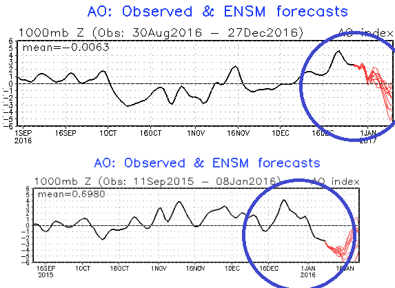 Obr.: Očakávaný pokles AO indexu počas tohtoročnej a zaznamenaný pokles počas minuloročnej zimy /http://www.cpc.ncep.noaa.gov/