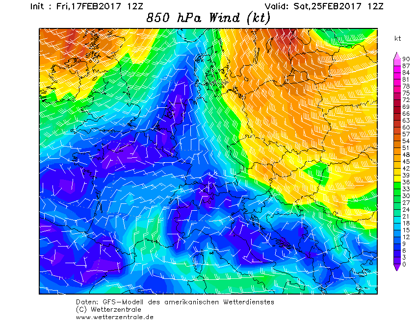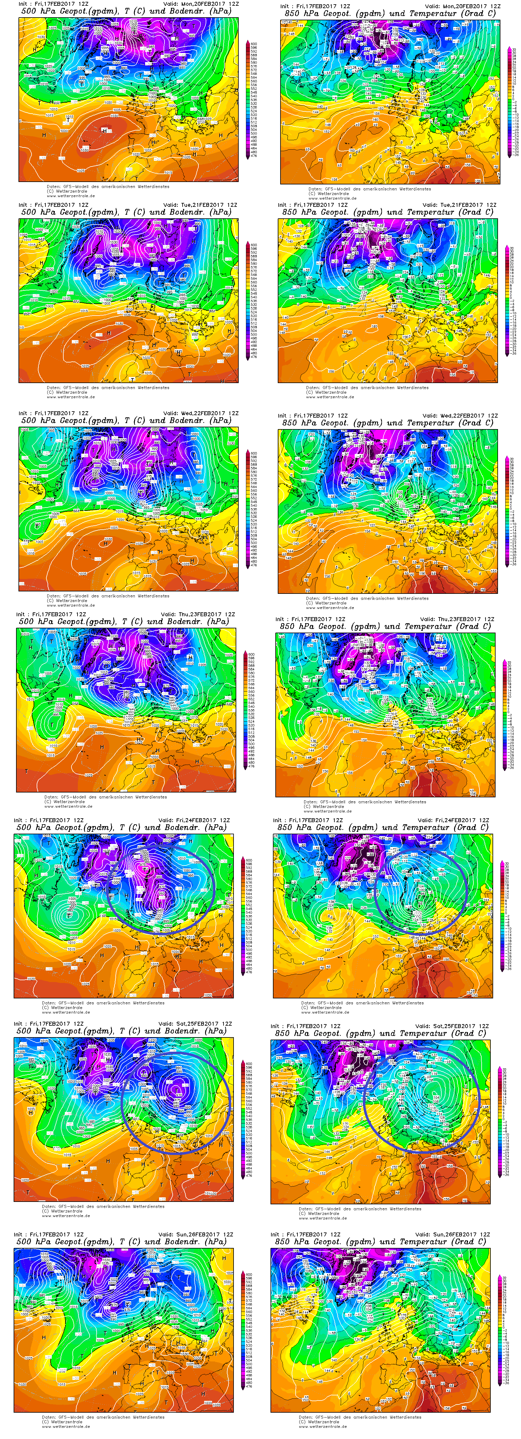 Obr.: Očakávané zmeny tlaku a teploty v 850 hPa v nasledujúcom týždni (od pondelka 20.2. do nedele 26.2. 2017 s dôrazom na piatok a sobotu - s hlbokou cyklónou postupujúcou severne od nášho územia, ktorej prechod bude predbežne spojený s výrazným zhoršením počasia /http://www.wetterzentrale.de//
