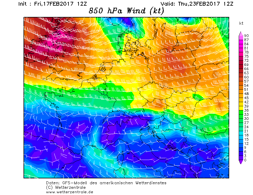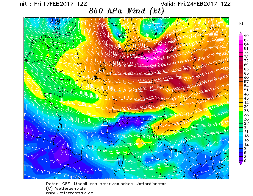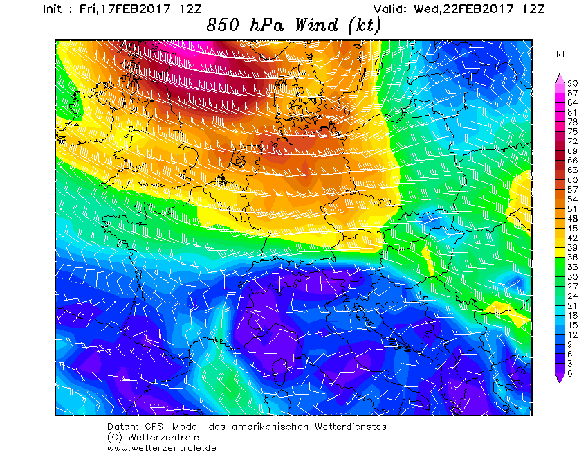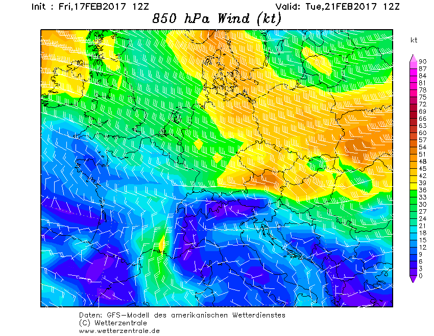 Obr.: Očakávané nárazy vetra na horách od utorka 21.2. do soboty 25.2. 2017 - až 4 z týchto dní hrozí na horách víchrica, v piatok dokonca orkán /http://www.wetterzentrale.de//
