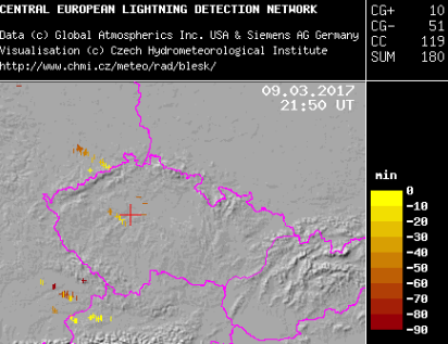 Obr.: Zaznamenané bleskové výboje vo štvrtok večer podľa CHMI /http://portal.chmi.cz/files/portal/docs/meteo/blesk/data_jsceldnview.html/
