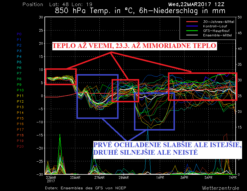 V piatok sa zvlnený front z Poľska začne opäť vracať na juh a posledným regiónom, ktorým vďaka vysokým horským bariéram chladný vzduch prejde bude juh stredného Slovenska. Tu očakávame v piatok aj najvyššie teploty, do +22/+23°C, na juhozápade a juhovýchode by ešte mala padnúť 20-ka, v severnej polovici sa už však začne ochladzovať, na Kysuciach, Orave a Zamagurí už môže byť len okolo +8°C. V sobotu už budeme za frontom v chladnejšom vzduchu - ráno sa na severe už vyskytne slabý mráz, denné teploty stúpnu od +7°C na severe do +17°C na juhu stredného Slovenska. Nedeľa prinesie ďalšie ochladzovanie - ráno bude +4/-1°C, popoludní len +7/+12°C, na severe a SV len okolo +5°C, pričom v ZA a PO kraji sa môže objaviť občasné sneženie. V pondelok by sa malo opäť vyjasniť a na väčšine územia to vyzerá na ranné mrazy 0/-5°C, v mrazových dolinách a kotlinách len okolo -7°C, v BA a na krajnom JZ sa ochladenie môže zaobísť bez mrazov. V utorok a stredu by sa malo opäť prechodne otepliť, počas vrcholenia blízko k +20°C, posledné marcové dni, t.j. nasledujúci štvrtok a v piatok však bude hroziť obrovský vpád studeného vzduchu - ten nás však môže minúť, v prípade, že masa studeného vzduchu sa vyleje nad východnú Európu a tlaková výš zo západnej Európy postúpi skôr nad náš región. Stredajší ranný beh z 06Z to však videl veľmi pesimisticky, s -10°C v 850 hPa nad našim územím, veľmi chladným počasím so snehovými prehánkami a maximálnymi teplotami len +3/+8°C, na severe +1°C pri čerstvom severáku a následným zosilnením mrazov, v dolinách až niekam medzi -10/-15°C. Nasledujúci beh z 12Z situáciu videl optimistickejšie, s rýchlejším postupom tlakovej výše zo západnej nad centrálnu Európu, pričom aj na Slovensko by skôr dorazila teplá a suchá vzduchová hmota a vpád studeného vzduchu až k -15°C v 850 hPa beh presunul až nad východnú Európu a nás by zasiahol len okrajovo. Nezostáva nám teda nič iné, len si vychutnať mimoriadne teplý štvrtok 23. marca a pripraviť sa na viac či menej výraznejšie ochladenia, po ktorých by v apríli mala doraziť ďalšia fáza jari s ešte vyššími teplotami.