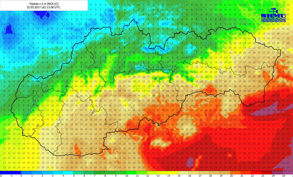 Už v posledných článkoch sme očakávali, že v stredu 22. marca budú medzi severozápadom a juhovýchodom krajiny veľké teplotné kontrasty. Tie boli nakoniec ešte o nejaký ten stupeň väčšie ako sa čakalo - kým pri Čiernej nad Tisou zaznamenali až +23,6°C, Čadca mala popoludní takmer o 20°C menej. Vo štvrtok sa zvlnený front, ktorý spôsobuje takéto veľké kontrasty vráti späť nad Poľsko a nad Slovensko sa nasunie veľmi až mimoriadne teplý vzduch z Maďarska a Balkánu - v Maďarsku mali v stredu prvý letný deň nad +25,0°C, Srbsko hlásilo v utorok +27,0°C a v stredu až +27,4°C. Na juhozápade sa tak vo štvrtok oteplí dosť blízko k úrovni letného dňa, až niekde k +24°C. V piatok bude teplé počasie na juhu doznievať, avšak zvlnený front sa už začne vracať z Poľska na juh - najmä S polovicu tak čaká ochladzovanie. To vyvrcholí okolo nedele a pondelka - najprv možným snežením v ZA a PO kraji, potom rannými mrazmi na väčšine územia. Ďalší vývoj je menej jasnejší, ale výrazné ochladenie na konci marca je stále v hre. Zrážok však bude málo a bude sucho, prevažne pod vplyvom vysokého tlaku so stredom západne od nášho územia.
