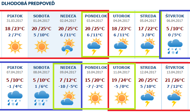 Apríl nás privíta brilantným, v najteplejších oblastiach dokonca pravým letným počasím, s maximálnymi teplotami od soboty do pondelka (1.-3.4.) až +20/+25°C. Takéto teploty sú v tejto ročnej dobe na hranici dlhodobých teplotných rekordov a budú spojené s izolovanými jadrami vzduchových hmôt s teplotou v 850 hPa (okolo 1 500 m n. m.) až +8°C. Prvý letný deň roka 2017 by tak v sobotu, nedeľu alebo pondelok na juhu územia mal padnúť - v sobotu za jasného počasia s krištáľovo čistou oblohou, v nedeľu už s možnosťou ojedinelej búrky a v pondelok, tesne pred príchodom studeného frontu s búrkami už miestami. V utorok a stredu sa počasie začne kaziť a od štvrtka do nedele očakávame jarnú vlnu chladu - spočiatku so snežením na severe pri denných teplotách len +3°C a daždi na juhu s teplotami cca +7/+13°C, postupne s pomerne silnými rannými mrazmi od 0/-5°C, v dolinách pri vhodných podmienok -5/-10°C. Letné teploty by sa však v tretej pentáde mesiaca mali predbežne vrátiť.