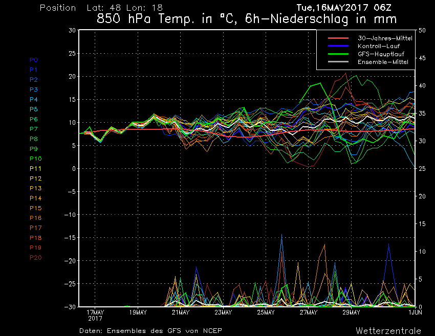 Obr.: Vyrovnaná teplotná krivka sľubuje do konca mája počasie, aké zažívame v tomto týždni - letné teploty, väčšinou slabo cez +25°C na juhu územia, prípadné búrky a ku koncu mája možná advekcia horúceho vzduchu /http://old.wetterzentrale.de/topkarten/fsavnmgeur.html/