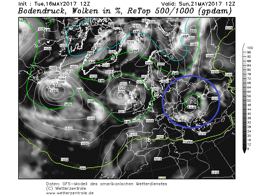 V utorok sa ešte najmä vo východnej polovici vyskytovali búrky, od stredy do piatka nás už čakajú 3 dni krásneho slnečného a teplého letného počasia. Úzky pás letných teplôt bude v piatok ponad našu oblasť siahať až po stredné Švédsko, čakáme teploty do +28°C. Tento úzky pás vzduchu s letnými teplotami cez víkend "zaškrtia" tlakové níže nad západnou Európou a Čiernomorím - nad Čierne more sa totiž prepadne plytý nízky tlak z východnej Európy. V sobotu ešte bude teplo, ale už s búrkami, nedeľa už bude chladnejšia. Od pondelka by sa malo letné počasie s teplotami v pondelok a utorok do +27°C vrátiť - z juhozápadu na severovýchod bude ponad strednú Európu putovať ďalšia, pôvodom Azorská výš. Zbytok budúceho týždňa môže byť búrkový, ale aj tropický - treba si počkať na dlhodobú predpoveď po zbytok týždňa, aké počasie sa bude na koniec mája potvrdzovať. Žiadne podstatnejšie ochladenia však do konca mája neočakávame.