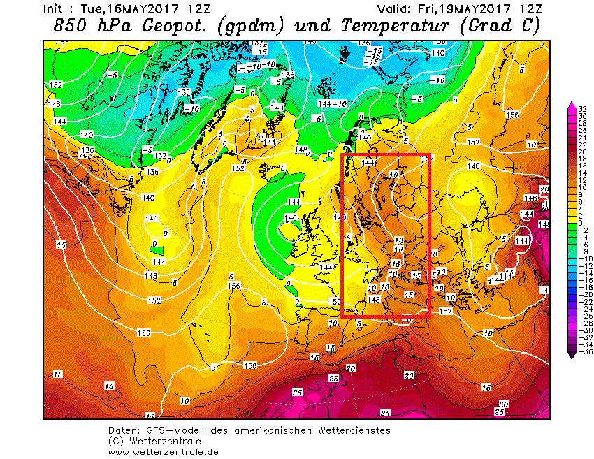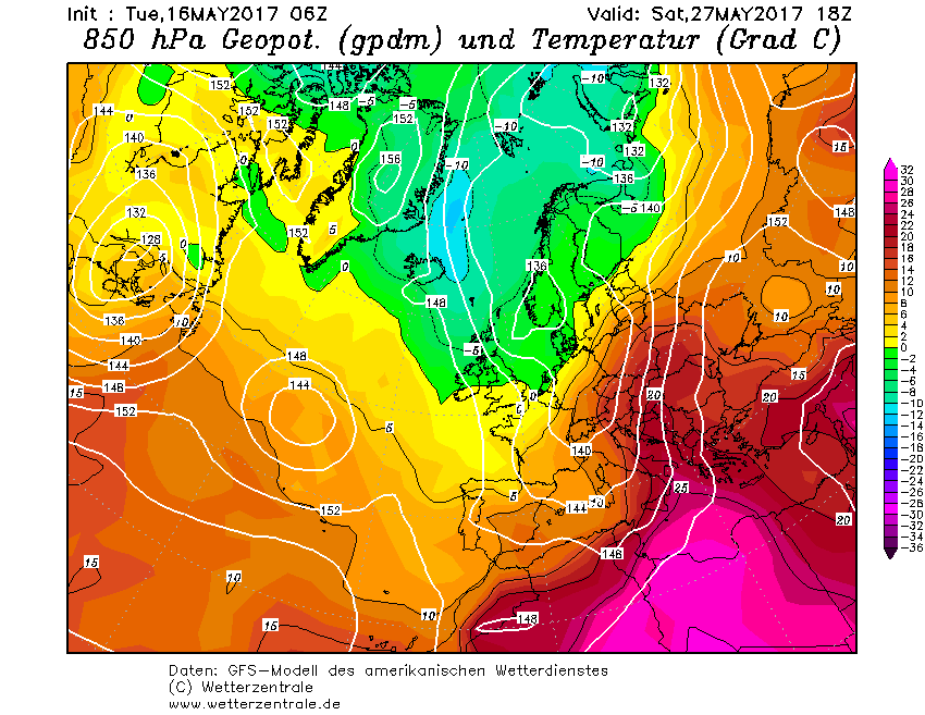 Obr.: Čerešnička na záver: ak by vyšla predpoveď z utorka 06Z, tak už budúci víkend by sme zažívali prvú vlnu horúčav roka, s teplotami na juhu okolo +32°C ... túto predpoveď však budeme musieť ešte do konca týždňa opakovane potvrdiť alebo vyvrátiť v našej dlhodobej predpovedi /http://meteoinfo.sk/predpoved-15-dni/