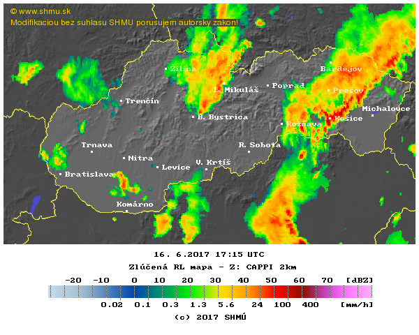 Naše výstrahy 2. stupňa pred silnými búrkami na piatok 16. júna pre celé územie Slovenska, ktoré boli v našom systéme aktualizované už od utorka (každý deň aktualizujeme nasledujúce 3 dni), sa ukázali ako opodstatnené a v piatok popoludní a večer, počas prechodu studeného frontu, boli búrky naozaj intenzívne. Najsilnejšie - červené jadrá a línie, sa prehnali západným, severným a východnom Slovenskom, z Košíc nám pozorovatelia hlásili večer až 4 cm krúpy a výstrahy 2. stupňa pre väčšinu územia Slovenska - tentokrát tie oficiálne, boli tesne pred príchodom búrok vyhlásené aj od SHMÚ. Najsilnejšie búrky zasiahli popoludní široiké okolie Trnavy, Nitry a Žiliny, večer sa najsilnejšie búrky presunuli do Prešovského a Košického kraja, ktorými prešla vo večerných hodinách súvislá línia silných búrok, ktoré okolo 21:00 - 22:00 opúšťajú naše územie na Zemplíne.