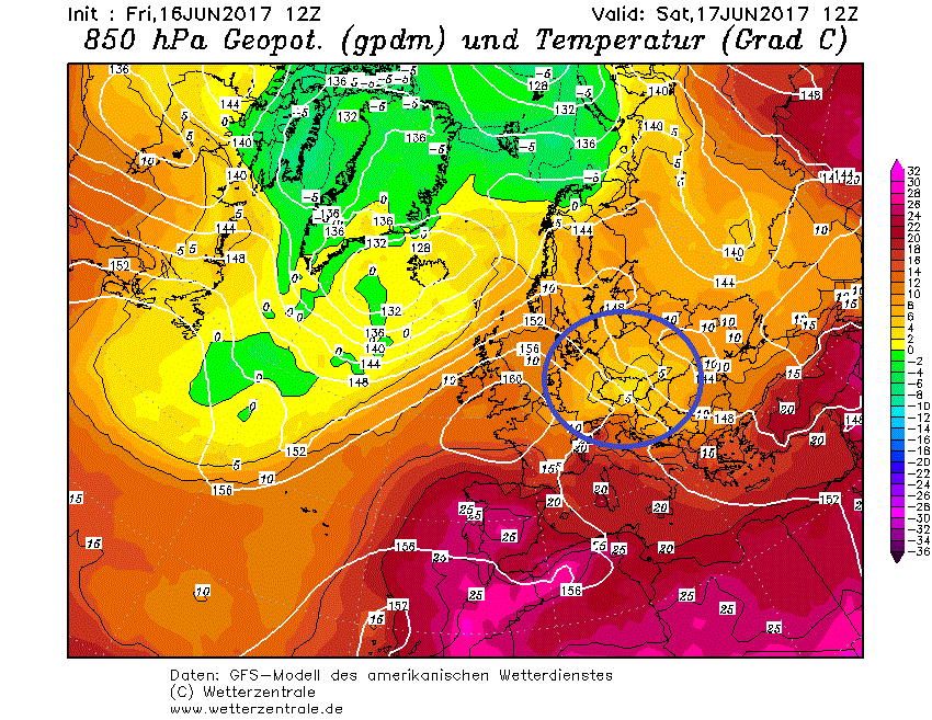 Obr.: Pomery v 850 hPa nad Európou a izolované jadro veľmi chladného a vlhkého oceánskeho vzduchu pod +5°C v 850 hPa nad Slovenskom v sobotu 17. júna 2017 /http://old.wetterzentrale.de/topkarten/fsavneur.html/