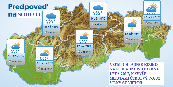 Po prechode piatkového studeného frontu sa nad Slovensko v sobotu dostane veľmi chladný a vlhký oceánsky vzduch. Na mnohých miestach očakávame prehánky, na severe aj trvalý dážď, miestami sa rozfúka čerstvý, na juhozápade až silný SZ vietor a na prvý letný mesiac bude veľmi, regionálne možno až extrémne chladno. Denné teploty vystúpia na juhu územia len na +15/+20°C, na severe bude len +9/+14°C - pre najchladnejšie kúty Slovenska dokonca očakáva model GFS (ktorý je dostupný pre každú obec SR na 14 dní na našej stránke: http://meteoinfo.sk/predpoved-slovensko) maximálnu dennú teplotu len +8°C (Oravská Lesná), kým pre najteplejší kút - Hurbanovo očakáva maximum len +19°C. V Hurbanove boli zatiaľ všetky dni od začiatku leta letné, teda s maximálnou dennou teplotou nad +25,0°C - iba jeden deň, 7. jún, priniesol nízke teplotné maximum, len +21,8°C. V Lieseku na Orave bola od začiatku leta zatiaľ najchladnejšia streda 14. júna s maximom +18,1°C, 7.6. mali +18,5°C a 5.6. +18,6°C. V sobotu sa teplota na Dolnej Orave bude pohybovať len okolo +12°C, takže pravdepodobnosť najchladnejšieho júnového dňa, s ohľadom na dlhodobú predpoveď do konca júna, ktorá neočakáva ďalšie výraznejšie ochladenia, je v sobotu takmer 100%. Sobota bude najchladnejším dňom júna 2017 na celom alebo takmer na celom Slovenska a ľahko sa môže stať, že sobota bude najchladnejším dňom celého leta 2017. Situácia sa začne zlepšovať až v nedeľu - aj keď na severe a východe len pomaly.