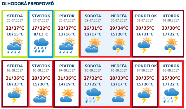V stredu sa miestami pri zväčšenej oblačnosti vyskytovali prehánky a bolo chladno, +18/+23°C, len na krajnom východe do +25°C. Vo štvrtok bude ešte chladnejšie a pretrvá aj občasný dážď, ktorý sa vyskytne na väčšine územia. Piatok bude posledným prehánkovým a chladnejším dňom, po ktorom však nastúpia avizované horúčavy. A tie môžu byť rekordné. Po niekoľkých nevydarených pokusoch v tomto roku, kedy sa malo otepliť do +38°C a nakoniec bolo len slabo nad +35°C všetko nasvedčuje tomu, že tentokrát nás čaká naozajstný vrchol leta. My, ale aj ďalší meteorológovia a klimatológovia počítame s teplotami až okolo +38°C, predpovedné modely, ktoré môžu nadhodnocovať nevylučujú ani 40-ku. Všetko už o niekoľko dní, s vrcholením okolo utorka, 1. augusta.